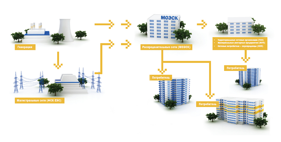 ПАО «МОЭСК» принимает электроэнергию в сеть от генерирующих компаний – субъектов оптового и розничного рынков, из сети Единой национальной (общероссийской) электрической сети (ЕНЭС) и от сетей, расположенных в смежных субъектах РФ. Затем через собственные сети передает электроэнергию конечным потребителям, в смежные сети (муниципальные унитарные предприятия (МУП), оптовым потребителям-перепродавца м (ОПП), в территориальные сетевые организации (ТСО).